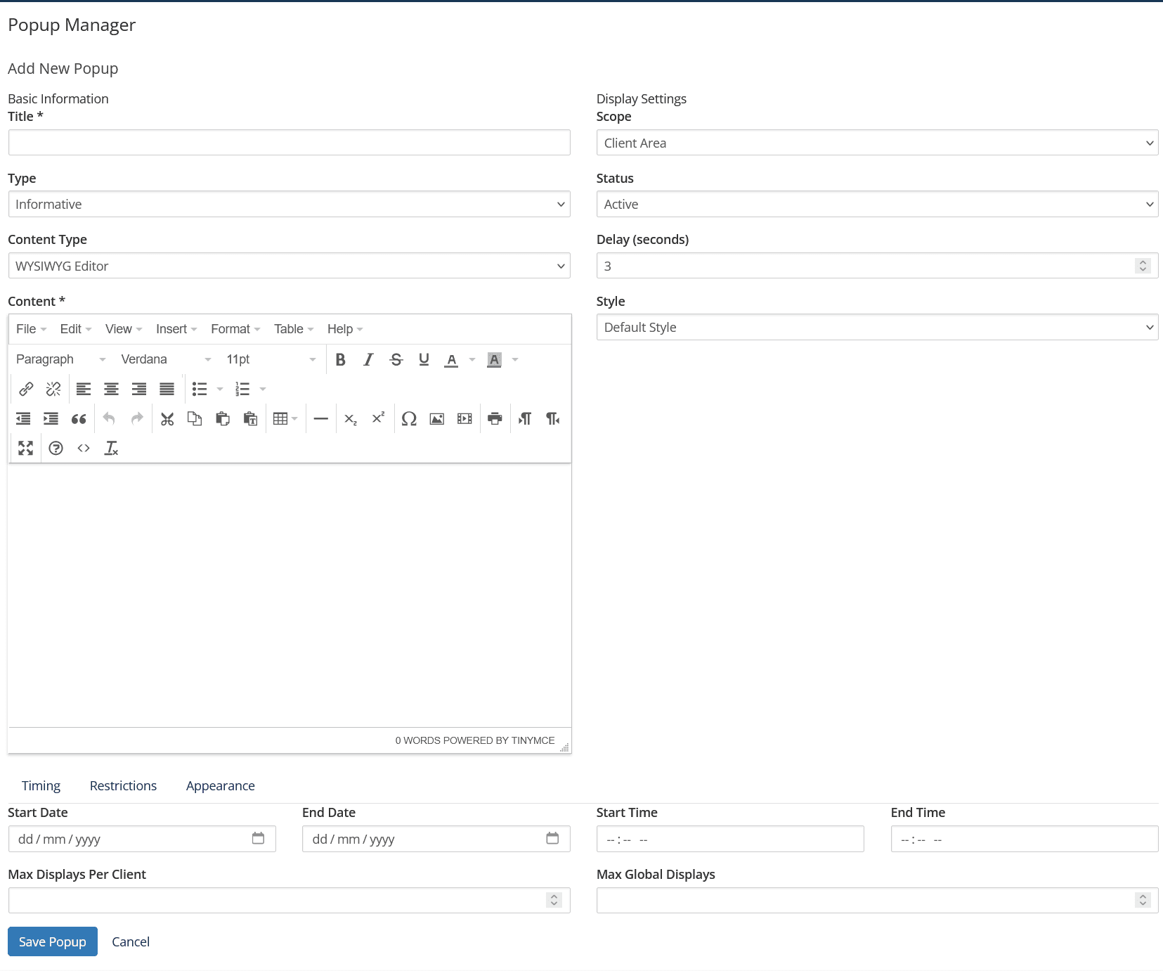 - Select popup type and content format: rich text (WYSIWYG), raw HTML, or images.