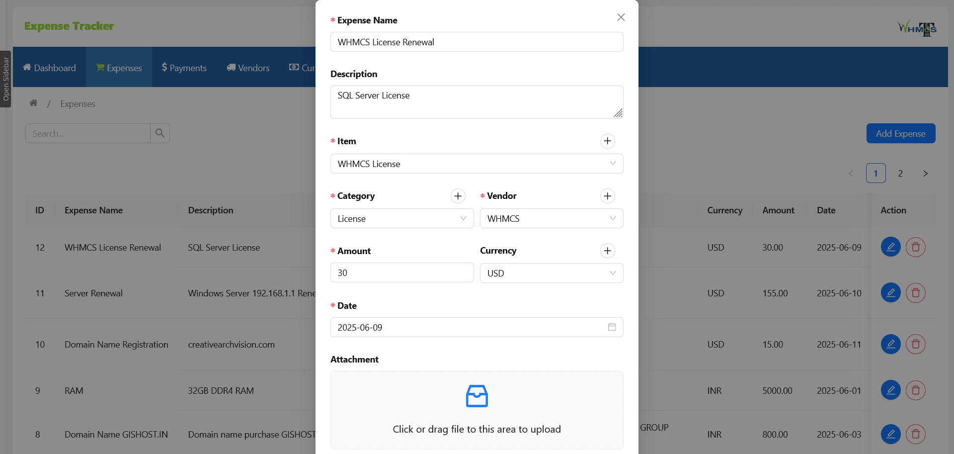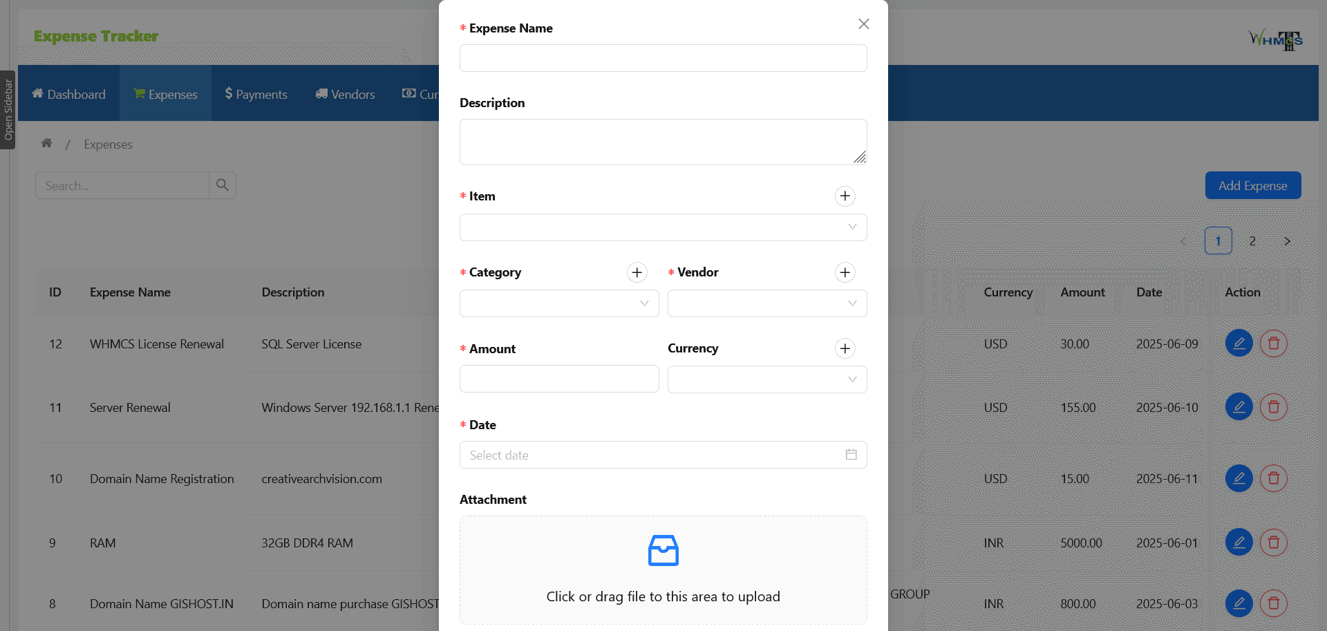 At its core, the module provides an intuitive interface where you can view, manage, and audit all your expense entries with ease. Each record can include details like amount, vendor, associated WHMCS product or service, currency, and custom tags. Categorize your spending for better visibility, and attach receipts or supporting documents to maintain a complete and auditable history